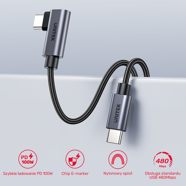 Kątowy kabel USB-C to przewód z jedną końcówką ustawioną pod kątem 90 stopni.