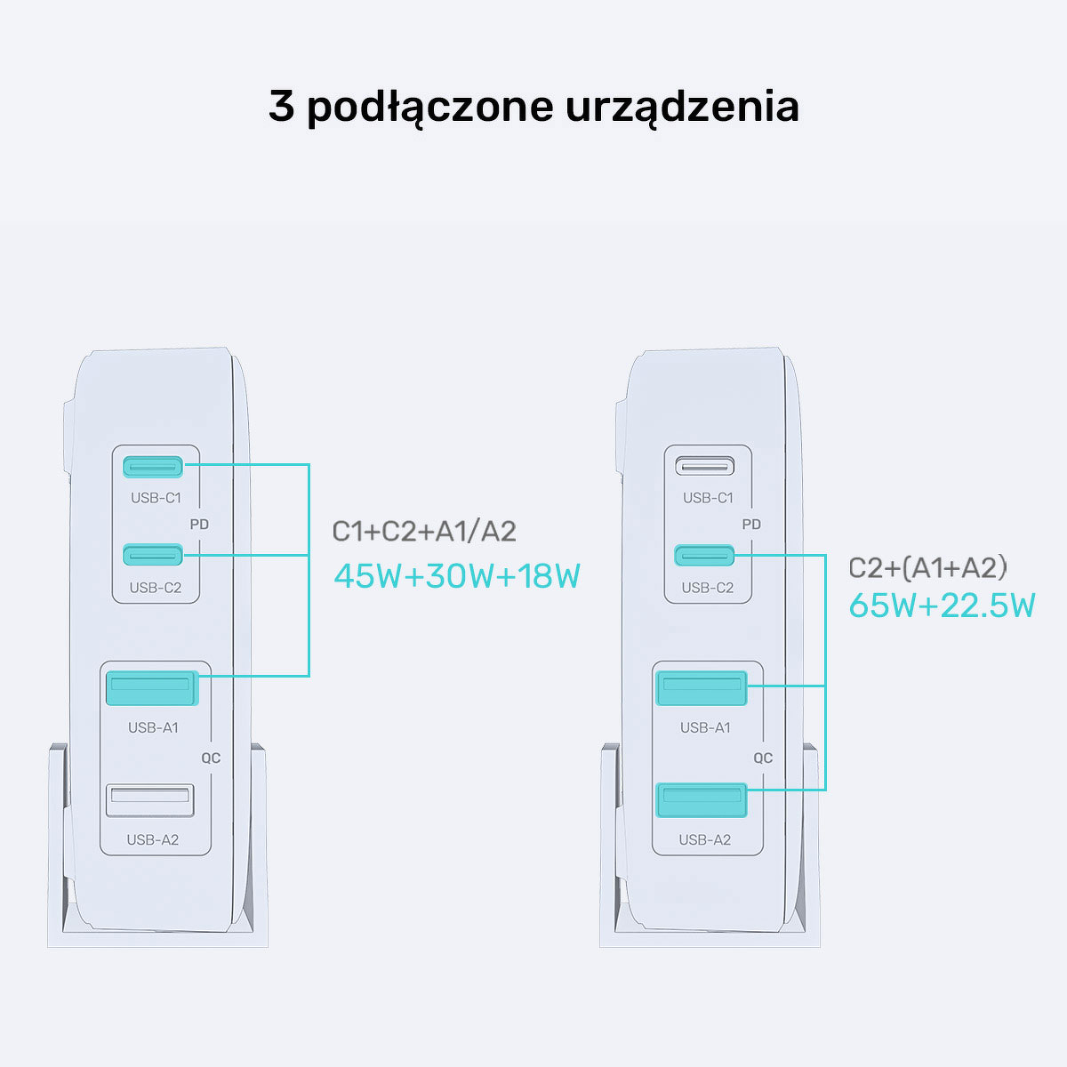 sprawi, że ich baterie zostaną zasilone sumaryczną mocą 22,5W. 3 urządzenia to odpowiednio 45+30+18W, lub 65W+22,5W rozkładane na dwa porty. A co jeżeli podłączymy akcesoria do wszystkich gniazd jednocześnie? W takiej sytuacji z USB-C popłynie łącznie 45, a z USB-A 18W energii.