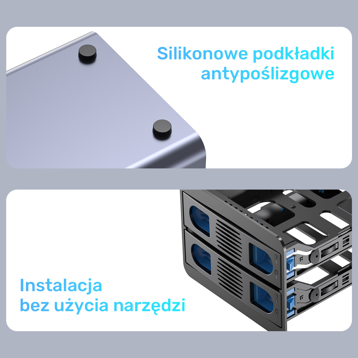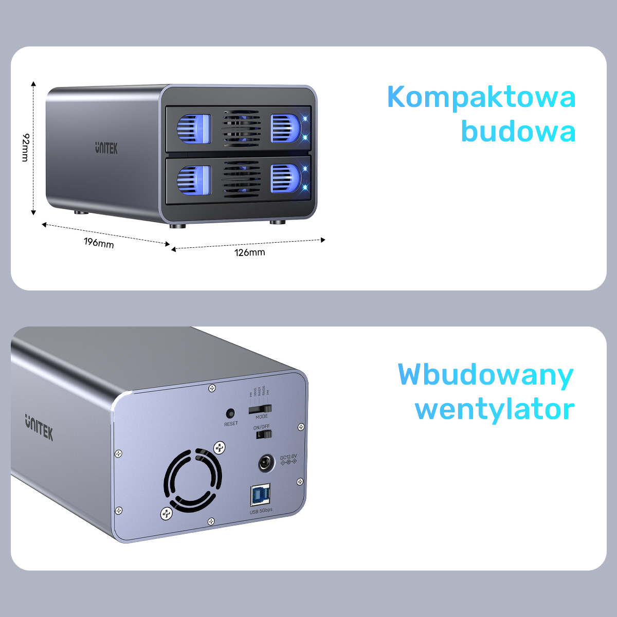Obudowa na dysk S1308B01-EU została zaprojektowana z myślą o długotrwałej, stabilnej pracy, nawet przy intensywnym użytkowaniu. Solidna aluminiowa konstrukcja skutecznie odprowadza ciepło, a wbudowany wentylator dodatkowo zwiększa efektywność chłodzenia. Dzięki temu Twoje dyski pracują w optymalnych warunkach, co wydłuża ich żywotność i zwiększa niezawodność przechowywanych danych. Dla osób, które przechowują duże ilości ważnych plików, takie jak zdjęcia, filmy czy dokumenty, stabilna praca dysków jest kluczowa.