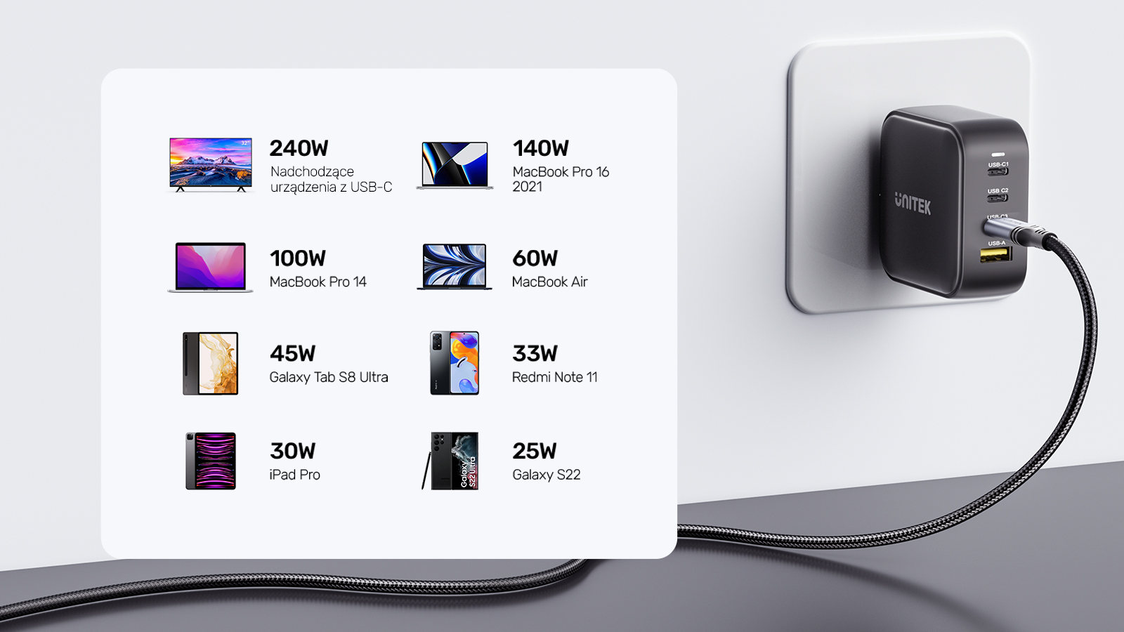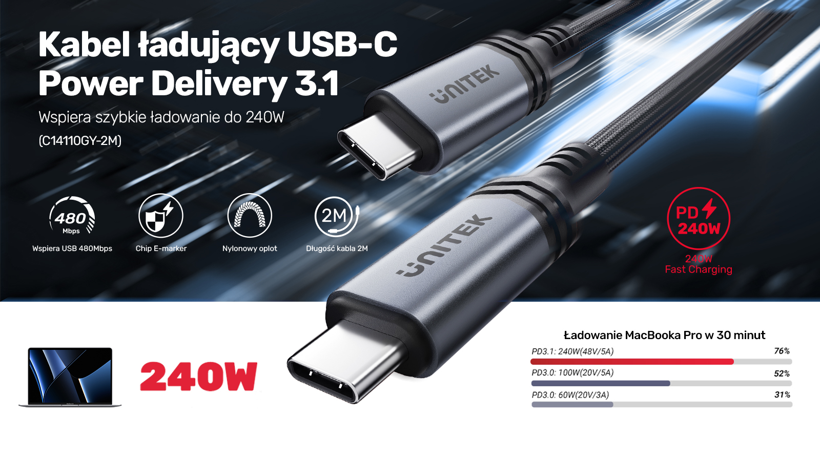 240 W - ładowarka o takiej mocy naładuje telefon nawet w kilkanaście minut! Jedyne czego potrzebujesz, to podłączyć do niej kabel, który obsłuży takie napięcie - czyli Unitek C14110GY-2M! To kabel obsługujący najwyższe napięcia ładowania. Akcesorium, dzięki któremu wykrzesasz prawdziwą moc z ładowarki Fast Charge, Quick Charge czy Speed Charge.