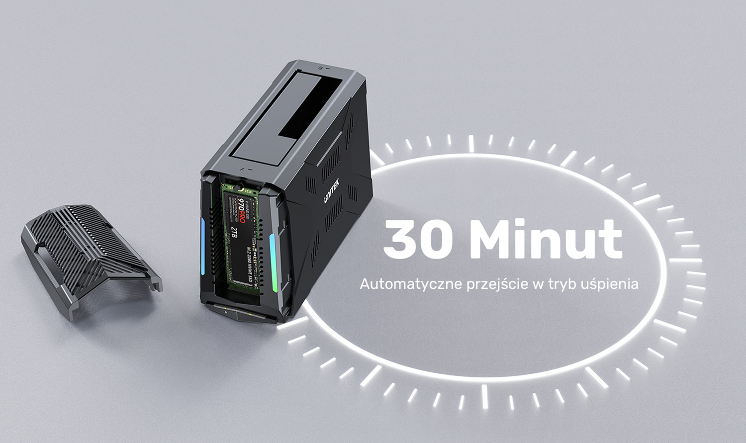 Kieszeń na dyski SATA i M.2 Unitek ma własny bardzo wydajny układ chłodzenia, który chroni nośniki danych przed przegrzaniem. Jeżeli urządzenie wykryje, że temperatura dysku przekracza 45 stopni, to automatycznie uruchomiony zostanie cichy wentylator, który obniży temperaturę dysku do optymalnego poziomu.