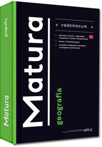 Vademecum matura. Geografia wydawnictwa Greg to książka zawierająca całość materiału potrzebnego do przygotowania się do matury w jej obecnie obowiązującej formule. Jest zgodna z najnowszą podstawą programową, a treści obejmujące materiał z klasy I dodatkowo oznaczono graficznie.