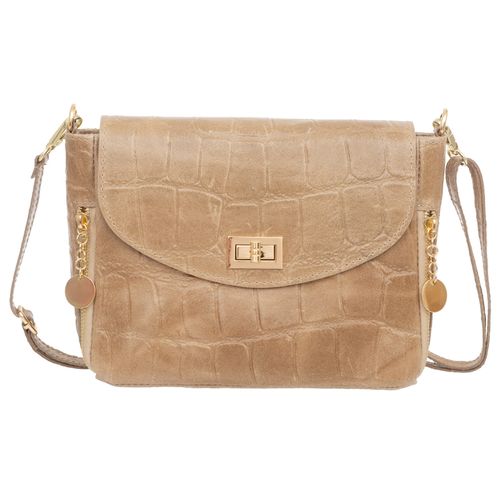 Torebka damska listonoszka znanej i cenionej na rynku europejskim marki VERA PELLE ITALY w kolorze BEŻOWYM. Wykonana została bardzo starannie z wysokogatunkowej skóry naturalnej z wytłoczonym wzorem. Torebka posiada długi odpinany i regulowany pasek, dzięki czemu możesz ją wygodnie nosić na ramieniu i dopasować do własnych preferencji. Główna klapa zamykana jest na obrotowy bigiel. Złote okucia oraz ozdobne suwaczki po bokach nadają jej modnego i nowoczesnego stylu. Torebka posiada pojemną komorę zamykaną na suwak a wnętrze wykończone jest podszewką. W środku dodatkowo znajduje się kieszonka zamykana na suwak, oraz dodatkowa otwarta kieszonka na telefon lub dokumenty. Dzięki usztywnianemu dnu listonoszka nie straci swoich kształtów nawet przy niewielkim wypełnieniu. Klasyczna, stylowa a zarazem elegancka, sprawdzi się zarówno podczas oficjalnych, jak i codziennych wyjść.