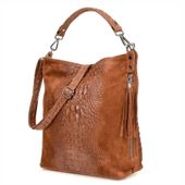 Włoska skórzana torebka damska typu shopper znanej i cenionej marki VERA PELLE ITALY w kolorze KONIAKOWEGO BRAZU. Wykonana została bardzo starannie z wysokiej jakości zamszowej skóry naturalnej. Wygląda niezwykle oryginalnie dzięki ciekawemu połączeniu zamszu z fakturą imitującą skórę krokodyla. Torebka posiada wygodną rączkę do noszenia w ręku a dodatkowy długi, odpinany i regulowany pasek pozwala ją nosić również wygodnie na ramieniu. Torebka posiada okucia w kolorze srebrnym. Jest duża i pojemna, dzięki czemu bez trudu pomieści format A4. Po prawej stronie torebki znajduje się duża i funkcjonalna kieszeń zamykana na suwak z ozdobnym frędzelkiem. Środek zamykany jest na suwak oraz wykończony wysokiej jakości podszewką. Torebka posiada jedną, zamykaną na suwak komorę, wewnątrz której znajduje się mała, boczna, zasuwana kieszonka. Z tyłu torebki znajdziesz kolejną praktyczną, zamykaną na suwak dużą kieszeń. Torebka jest bardzo wygodna w codziennym użytkowaniu a jej wygląda sprawia, że będzie pasowała do większości codziennych stylizacji. Jest lekka, a jej kształt i materiał sprawiają, że jest bardzo wygodna w użytkowaniu.