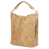 Włoska skórzana torebka damska typu shopper znanej i cenionej marki VERA PELLE ITALY w kolorze CIEMNEGO CIEPŁEGO BEŻU. Wykonana została bardzo starannie z wysokiej jakości zamszowej skóry naturalnej. Wygląda niezwykle oryginalnie dzięki ciekawemu połączeniu zamszu z fakturą imitującą skórę krokodyla. Torebka posiada wygodną rączkę do noszenia w ręku a dodatkowy długi, odpinany i regulowany pasek pozwala ją nosić również wygodnie na ramieniu. Torebka posiada okucia w kolorze srebrnym. Jest duża i pojemna, dzięki czemu bez trudu pomieści format A4. Po prawej stronie torebki znajduje się duża i funkcjonalna kieszeń zamykana na suwak z ozdobnym frędzelkiem. Środek zamykany jest na suwak oraz wykończony wysokiej jakości podszewką. Torebka posiada jedną, zamykaną na suwak komorę, wewnątrz której znajduje się mała, boczna, zasuwana kieszonka. Z tyłu torebki znajdziesz kolejną praktyczną, zamykaną na suwak dużą kieszeń. Torebka jest bardzo wygodna w codziennym użytkowaniu a jej wygląda sprawia, że będzie pasowała do większości codziennych stylizacji. Jest lekka, a jej kształt i materiał sprawiają, że jest bardzo wygodna w użytkowaniu.