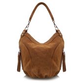 Włoski skórzany worek marki VERA PELLE ITALY w kolorze CAMEL. Torebka wyprodukowana została we Włoszech z najwyższej jakości, pięknie pachnącej i miłej w dotyku skóry naturalnej zamszowej z dbałością o najmniejsze szczegóły. Zamykana jest na praktyczny suwak a w środku wykończona solidną podszewką. Posiada dwie oddzielne komory przedzielone przegrodą zamykaną na suwak, dodatkową kieszonkę na suwak na bocznej ściance oraz niedużą kieszonkę na telefon komórkowy lub portfel. Z tyłu torebki znajduje się dodatkowa duża kieszeń na suwak. Po bokach posiada ozdobne frędzelki, które służą do otwierania funkcjonalnych kieszonek bocznych. Dzięki takiej ilości kieszonek torebka jest bardzo pojemna i praktyczna. Można ją wygodnie nosić w ręku lub na ramieniu, dzięki dołączonemu dodatkowemu długiemu paskowi. Główna rączka torebki jest również odpinana.