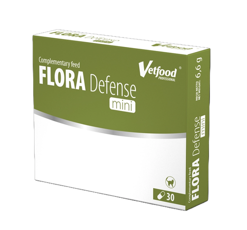 Flora Defense mini dedykowana jest zwierzętom o wadze do 5 kg masy ciała, zawiera kultury drożdży Saccharomyces cerevisiae var. boulardii i bakterie kwasu mlekowego Lactobacillus rhamnosus oraz prebiotyk (oligofruktoza).