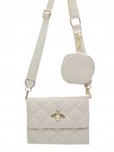 Zgrabna, a zarazem praktyczna torebka nie obciąży stylizacji. Jednokomorowy model pomieści wszystkie najpotrzebniejsze drobiazgi, które chcesz mieć zawsze przy sobie. W środku znajdują się dwie kieszonki (każda na dwie karty). Komora przedzielona jest kieszonką zamykaną na zamek. Dodatkowo do torebki dołączony jest mały, zapinany na zamek portfelik na drobne przedmioty, który można odpinać. Tył torebki jest gładki. Torebka jest usztywniana, nie zmienia więc swego kształtu pod wpływem zawartości. Charakteru listonoszce dodaje pikowane na całej powierzchni oraz pszczoła za perełką na przedniej klapie.