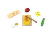 Dzieci stają się bardziej towarzyskie, kreatywne, pewne siebie. Zestaw ten kształtuje umiejętności społeczne, ćwiczy motorykę rąk, rozwija myślenie i wyobraźnię dzieci. Polecany do przedszkoli i ośrodków rozwoju. Zestaw zawiera drewniane owoce oraz akcesoria: - deska do krojenia - nożyk - chlebek tostowy - bułka długa - pomidorek - ser - jajko -ogórek