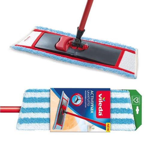 Vileda Mop płaski Active Max. Mop płaski Active MAX to idealny pomocnik w codziennym sprzątaniu. Mop płaski Vileda Active MAX przeznaczony jest do czyszczenia na mokro. Może być stosowany do każdego rodzaju podłóg. - Ergonomiczny - trapezoidalny kształt mopa ułatwia dotarcie do narożników i kątów - Skuteczny - profilowana struktura plastikowej nakładki zapewnia równomierny docisk na całej powierzchni, zwiększając efektywność czyszczenia - Uniwersalny - sprawdzi się na każdym rodzaju podłóg - Wygodny - łatwe umieszczanie wkładu dzięki składanej stopie mopa - Wyposażony we wkład, który można prać w pralce - Wymiary mopa do podłóg Active Max: nakładka trapez 43 x 37 x 9,5 cm; wkład 47 x 42 x 15 cm; odległość pomiędzy kieszonkami, w które wkłada się nakładkę 30 cm; długość drążka 130 cm - Dostępny w sprzedaży jest także wkład wymienny Active Max - Mop Active Max wyżyma się ręcznie. Cena za 1 szt.