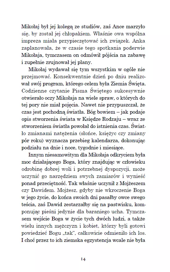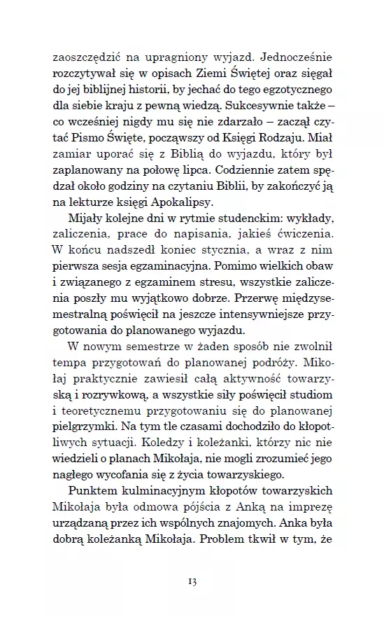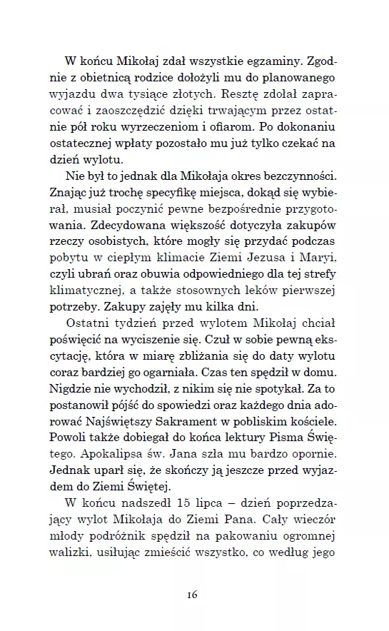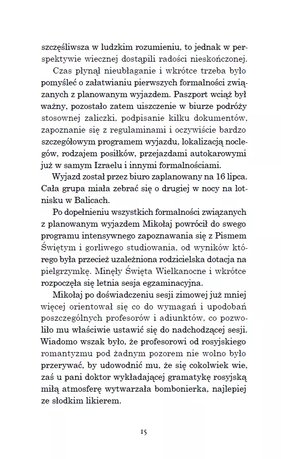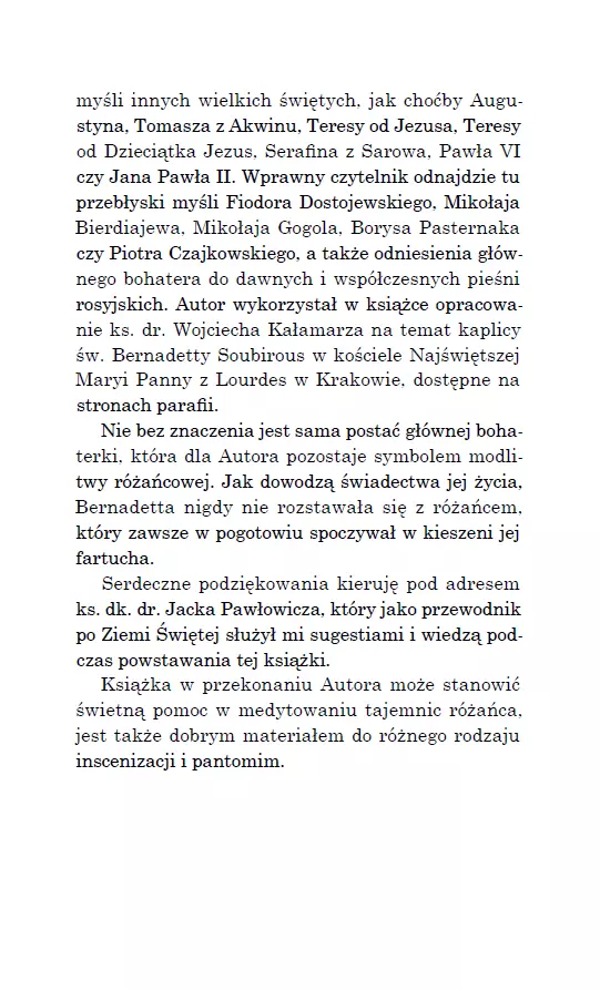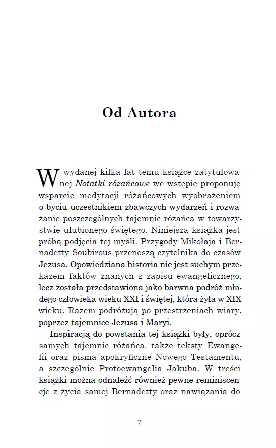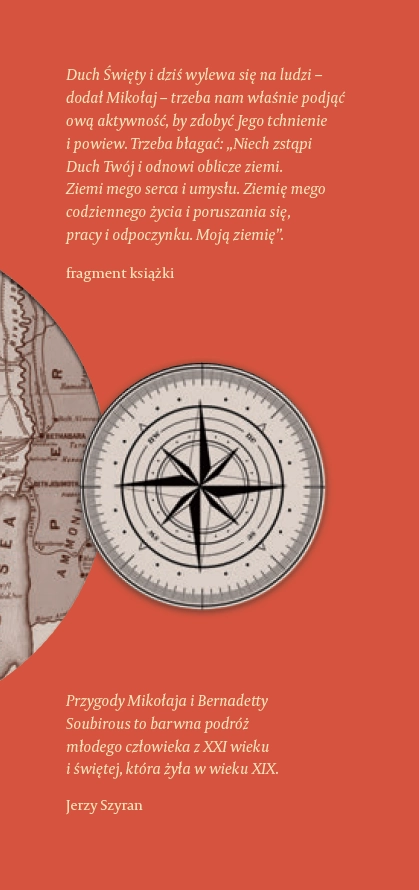 Każdy powinien pojechać choć raz tam, gdzie wszystko się zdarzyło! Mikołaja pochłaniają myśli o wyjeździe do Ziemi Świętej. Rezygnuje z życia towarzyskiego i wszystkie siły koncentruje na studiach oraz przygotowaniu do planowanej pielgrzymki. Choć koledzy i koleżanki nie rozumieją jego zachowania, on się tym nie przejmuje i konsekwentnie dąży do celu. Nie wie jeszcze, że trafi do Ziemi Świętej w czasach Cezara Augusta i spędzi wakacje w towarzystwie Bernadetty Soubirous. Benia pokazuje mu Ziemię Świętą, jakiej nikt nie zna. Razem przemierzają: Nazaret, En Kerem, Betlejem, świątynię jerozolimską, wędrują nad Jordan, do Kany Galilejskiej, na górę Tabor, do Wieczernika, na Golgotę, zatrzymują się przy grobie Jezusa, są świadkami zmartwychwstania oraz „zaśnięcia” Miriam. Jak zakończy się ta podróż i czy jeszcze kiedyś będzie mu dane spotkać się z Bernadettą? Autor zaprasza do podróży w głąb wiary. Pokazuje, jak iść śladami Maryi i Jezusa. Pomaga w medytowaniu tajemnic różańca świętego. Jerzy Szyran OFMConv – ur. w 1968 roku w Pabianicach, franciszkanin, doktor teologii. Jest wykładowcą teologii moralnej, cenzorem kościelnym książek i treści religijnych, redaktorem naczelnym rocznika „Lignum Vitae”, członkiem polskiego Stowarzyszenia Teologów Moralistów. Autor wielu publikacji naukowych i popularyzatorskich z zakresu teologii moralnej. Prowadzi stronę internetową szyran.franciszkanie.pl. Laureat nagród: Pro Redemptione i Feniks 2024.