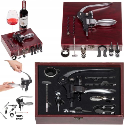 Elegancki zestaw do wina w drewnianej skrzynce.Całość zapakowana w walizkę o wymiarach: 25 x 28 x 6,5 cm.