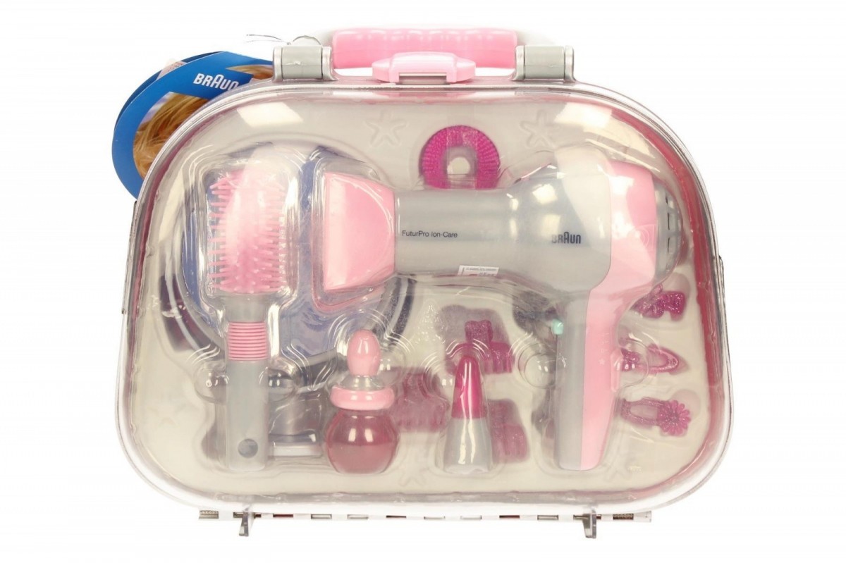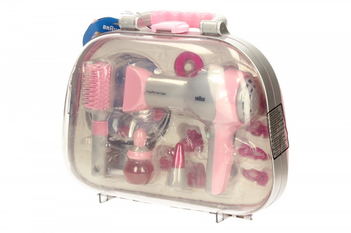 Zawiera lusterko, suszarkę, szczotkę, grzebień, i wiele innych akcesorii a to wszystko zamknięte w ślicznej walizce.