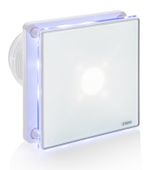 Wentylator łazienkowy STERR BFS100LT ze szklanym panelem przednim w kolorze białym, białym podświetleniem LED, wyłącznikiem czasowym i zaworem zwrotnym. Gustowny i nowoczesny wygląd.