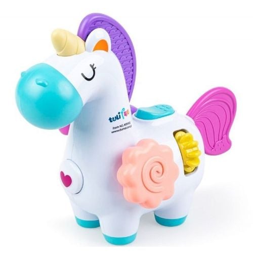 Sensoryczne stworzenie, wprost z bajkowego świata! Uroczy jednorożec kryje w sobie wiele praktycznych zadań, które pomogą maluszkowi rozwijać motorykę małą i odkrywać zależności przyczynowo - skutkowe. Każda ze stron jednorożca to inna zabawa. Z przodu znajduje się przycisk z serduszkiem, będący zarazem piszczałką, jego grzbiet zdobią przyciski do klikania, a boki wyposażone zostały w terkoczący kwiatek i kółeczko, wypełnione grzechoczącymi koralikami, oraz ruchome elementy. Jakby tego było mało, ogon zwierzaka także jest ruchomy, a pod nim znajduje się gwiazdka, którą można przesuwać na boki.
