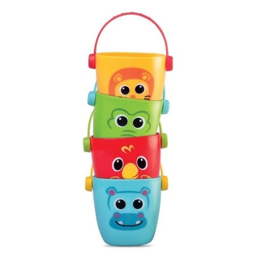 Zestaw czterech kolorowych wiaderek to pomysł na kreatywną zabawę! Każde z nich zdobi inny obrazek z cyferką, a dodatkowo, posiadają one zróżnicowane otwory na spodzie. Dzięki temu, kiedy nabierzemy w wiaderka wody, każde z nich będzie ją przelewało w inny sposób! Ta uniwersalna zabawka sprawdzi się nie tylko podczas kąpieli, ale także do zabawy w piasku. Wiaderka można składać jedno w drugie, co ułatwia ich przechowywanie.