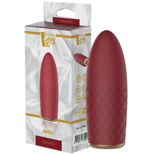 Marly to stylowy, wibrujący masażer intymny. Nowoczesny, elegancki stymulator wykonany z wysokiej jakości miękkiego silikonu w kolorze bordowym. Masażer na dole ma fakturę w kształcie rombu. Dzięki poręcznym wymiarom i przemyślanemu kształtowi urządzenie wygodnie leży w dłoni, co umożliwia precyzyjne stosowanie. Programy obejmują 7 wibracji i 3 prędkości odpowiedzialne za przyjemną zabawę. Teksturowana powierzchnia Marly z łatwością przenosi wibracje dostarczając silnych wrażeń.
