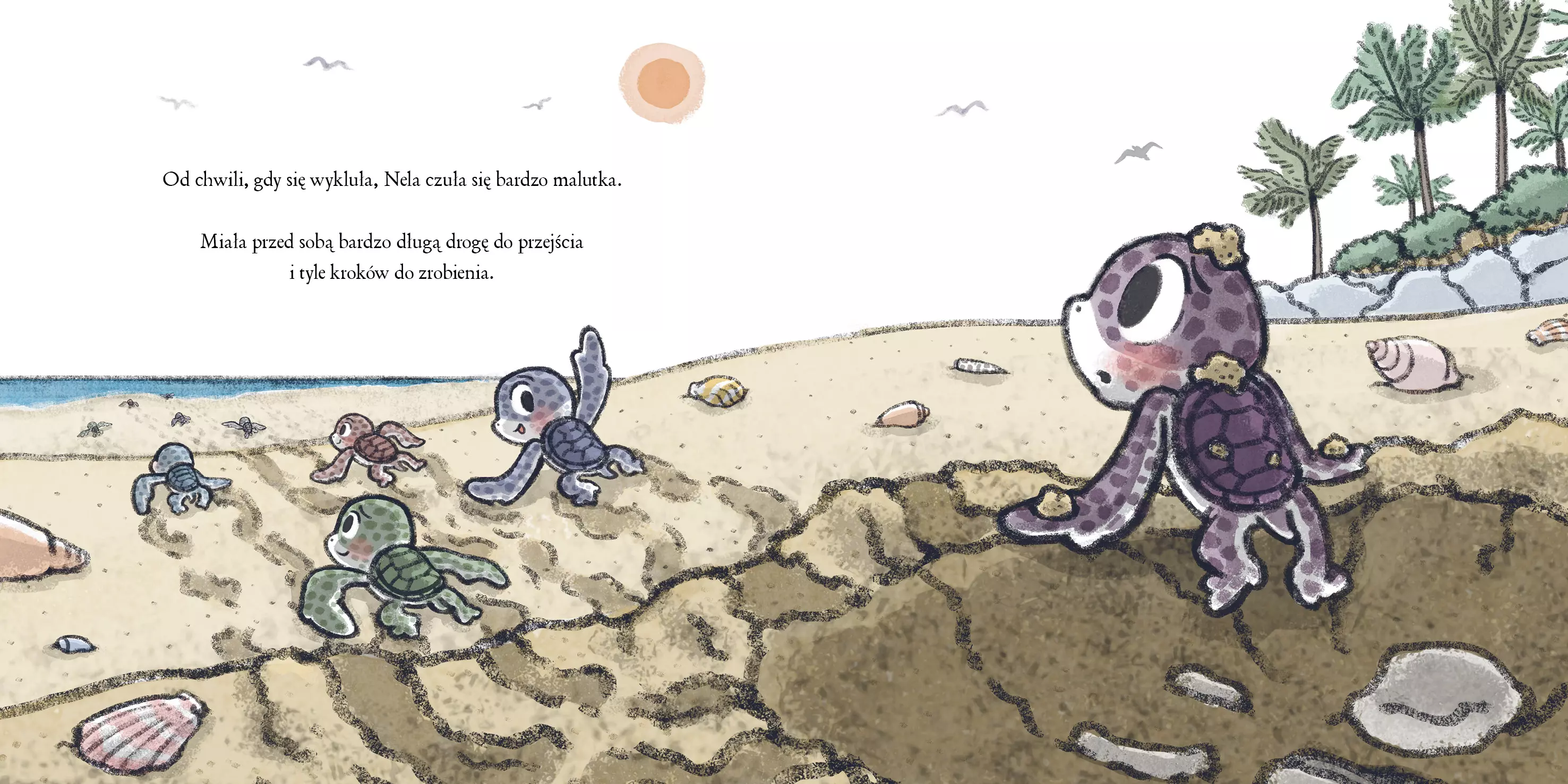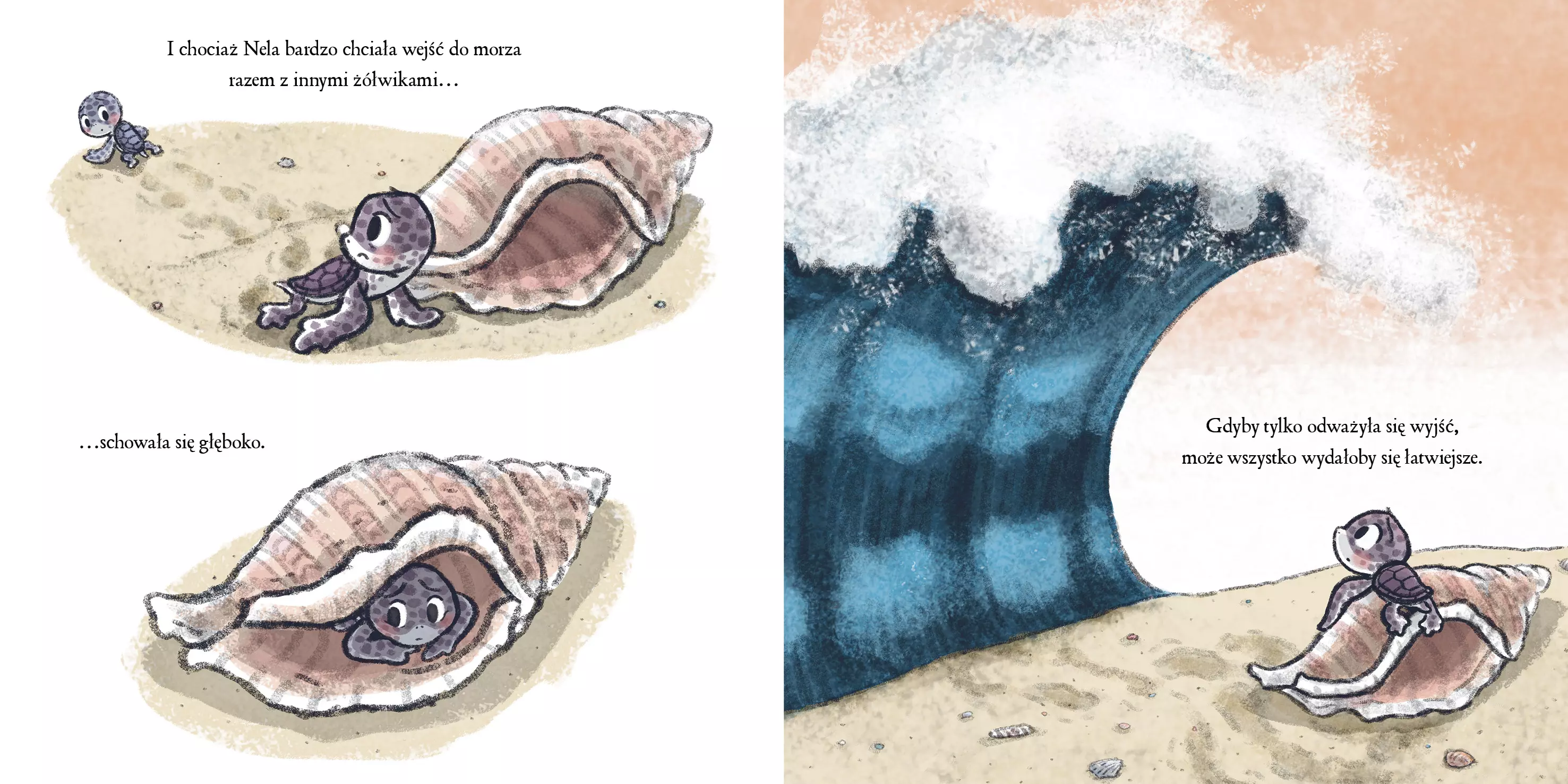 Najnowsza książka autorki bestsellerów A królik słuchał (ponad 60 tys. sprzedanych egzemplarzy w Polsce) i Aby się wznieść. Nela, mała żółwica, dopiero co przyszła na świat. Jej bracia i siostry ruszyli już w stronę oceanu, ale ona została na plaży – przerażona głośnymi falami i ogromem nieznanego. Kiedy zapada noc, a piasek robi się zimny, Nela uświadamia sobie, że za falami jest coś więcej – cały świat do odkrycia. Poruszająca i pięknie zilustrowana historia o przezwyciężaniu lęków i otwieraniu się na nowe przygody. Książka ukazuje się w kolekcji „Mamania blisko dziecka”, która towarzyszy najmłodszym czytelnikom w ich codziennych doświadczeniach. Wraz z bohaterami naszych książek dzieci odkrywają siłę przyjaźni, wyobraźni, uczą się pokonywać trudności, rozpoznawać emocje i stawiać czoła wyzwaniom. Tytuł oryginalny: Nellie's Big Splash Tłumacz: Zofia Raczek