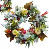 Ten wysokiej jakości wianek jesienny na drzwi, model girlandy dekoracyjnej, zachwyca nie tylko naturalistycznym i eleganckim wyglądem, ale także precyzyjnym wykonaniem. Kompozycja z realistycznych sztucznych dyni, kolorowych liści, zielonych gałązek i jagód tworzy pełną, gęstą ozdobę, która doskonale oddaje jesienny klimat i zapewnia długotrwałe piękno w każdym wnętrzu.