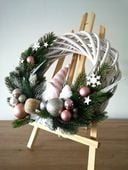 Ten wyjątkowy wieniec bożonarodzeniowy z różowym skrzatem w czapeczce zachwyca bogatym, ręcznym wykończeniem i starannie dobraną pastelową kolorystyką zimową. Z dużą ilością dodatków, takich jak bombki, gwiazdki i inne ozdoby, tworzy niepowtarzalny akcent, który idealnie zdobi drzwi, ściany czy stół, zapewniając trwały urok i radość przez całe święta.