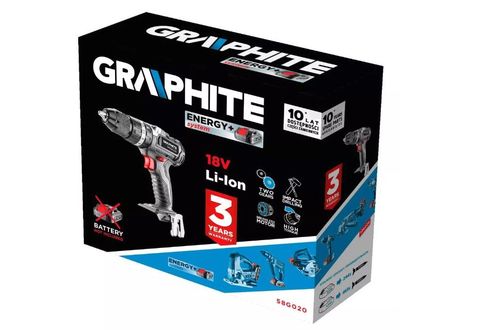 Dwubiegowa wiertarko-wkrętarka GRAPHITE, współpracująca z akumulatorami 18V Li-Ion GRAPHITE Energy+.