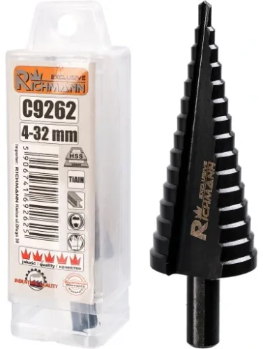 To wysokiej jakości wiertło stopniowe stożkowe marki Richmann, model C9262, wykonane ze stali szybkotnącej HSS z podwyższoną zdolnością skrawającą. Jego unikalna konstrukcja gwarantuje doskonałą jakość wykończenia otworów, nawet w najtrudniejszych warunkach.