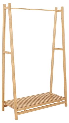 Wieszak Bali w całości wykonany jest z bambusa w naturalnym kolorze. Posiada delikatną, ale stabilną konstrukcję. Składają się na niego: drewniany drążek, na którym można zawiesić wieszaki oraz szeroka dolna półka z cienkich listew, na której z powodzeniem można przechowywać buty.