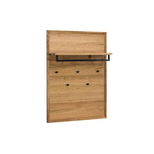 Niezwykle przydatny panel z wieszakami i relingiem do przedpokoju z kolekcji Viborg. Wykończenie w postaci dębowego forniru szczotkowanego, woskowanego i olejowanego dopasowane jest do pozostałych mebli z kolekcji, tak jak i uchwyty i reling w kolorze czarnym. Panel wyposażony został w niezwykle przydatną półkę nad wieszakami, można odłożyć na nią nakrycie głowy, szalik lub rękawiczki.