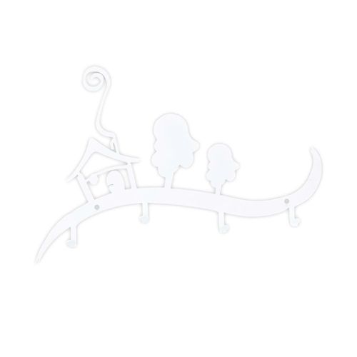 Wieszak ścienny Domek jest idealnym rozwiązaniem do przedpokoju. Stylowy wieszak z motywem domku oraz drzew ociepli każde wnętrze i pomoże stworzyć przyjazną atmosferę mieszkania. Wycinane laserowo elementy wieszaka są bardzo trwałe, odporne na zarysowania oraz zabrudzenia. Na pofalowanej listwie wieszaka zostały umieszczone 4 haki , o obciążeniu 3kg każdy, na których można powiesić klucze, torebki lub kurtki. Listwa dostępna jest w dwóch kolorach. Maksymalne obciążenie listwy to 12kg. Do wieszaka załączany jest zestaw montażowy, który składa się z kołków, zaślepek i śrubek. Wysokość: 28cm Szerokość: 41cm.