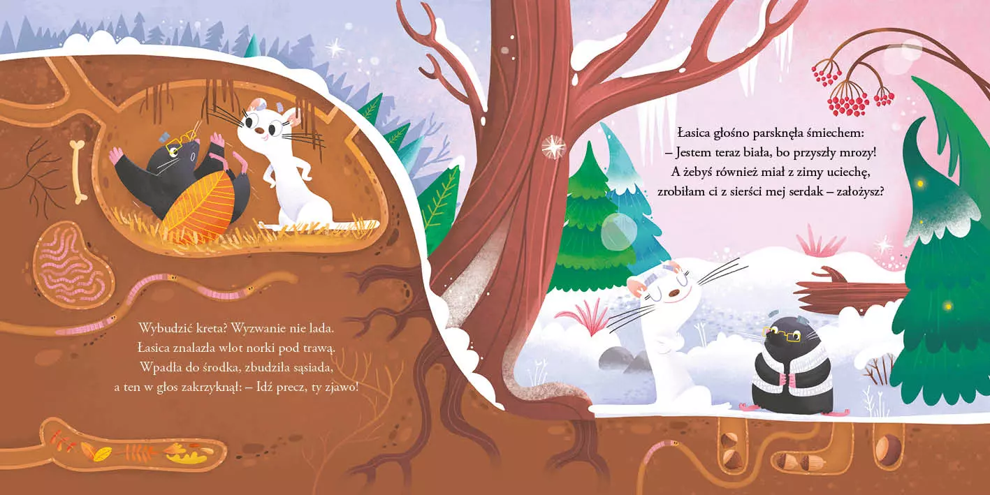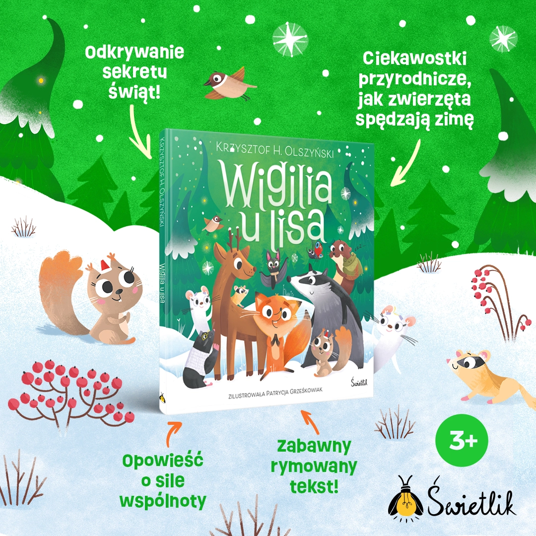 Magia świąt w sercu zimowego lasu! Poznaj lisa, mazurka, łasicę, borsuka, wydrę i wielu innych mieszkańców lasu, którzy postanawiają przerwać swój sen zimowy i wspólnie spędzić Gwiazdkę! Leśne zwierzęta tyle razy słyszały o magii świąt i niezwykłej atmosferze, która im towarzyszy, że nadszedł czas, aby przekonać się na własnej skórze, w czym tkwi sekret świąt. W dzień wigilijny zwierzęta się budzą, aby rozpocząć przygotowania do świątecznej kolacji. Jest tylko jeden, malutki problem – zimą wszystko wydaje się szare, brakuje pożywienia, panuje ciemność i co najgorsze… jest zimno! Tego leśni mieszkańcy nie przewidzieli. Czyżby przespanie zimy wcale nie było takie złe? Przyjaciele jednak nie poddają się ponuremu nastrojowi – postanawiają wspólnie spędzić ten wyjątkowy dzień w roku i rozpoczynają przygotowania w norce lisa. Nietoperz zawiesza dekoracje, ptaszki ucierają kutię, a wszędzie rozchodzi się przyjemny zapach świątecznego kompotu! Wspólne przygotowania do Wigilii sprawiają, że zima przestaje być taka straszna, a ten najtrudniejszy czas w roku (szczególnie w lesie) wypełnia się radością i ciepłem. Ta pełna uroku opowieść o przyjaźni, współpracy i radości ze wspólnego świętowania przypomina, że nawet w trudnych chwilach warto być razem.