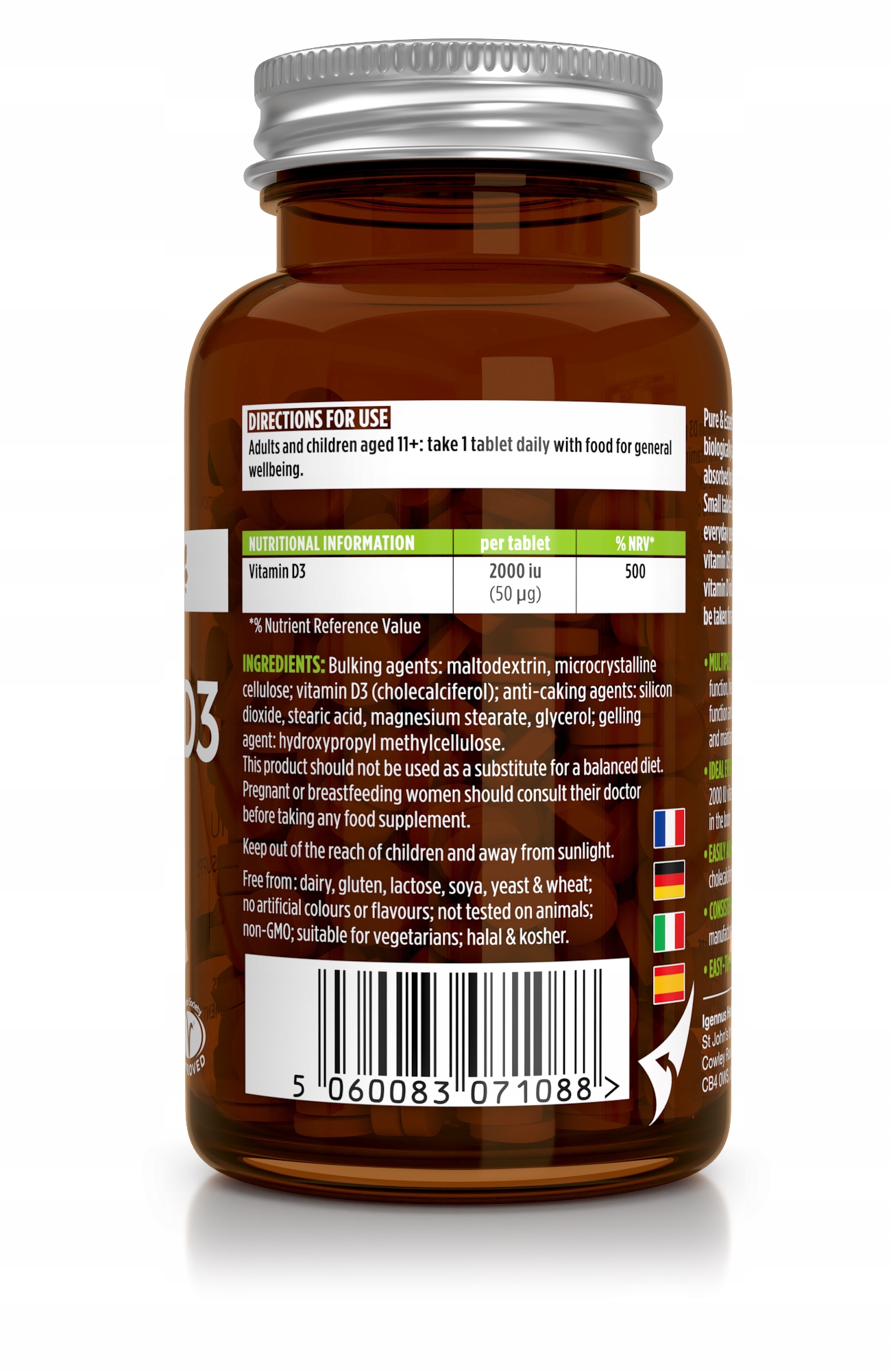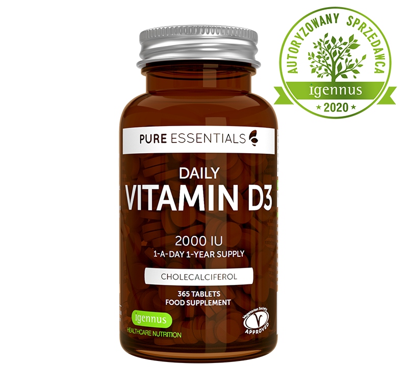 Jedna mała tabletka dostarcza 2000IU witaminy D3, czyli dawkę odpowiednią do suplementacji przez cały rok.