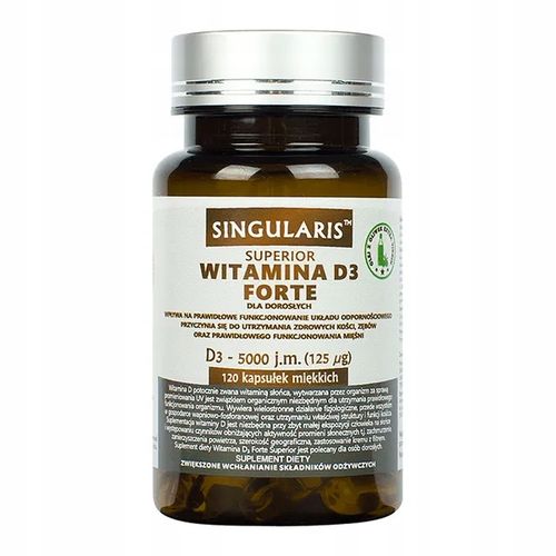 Wysokiej jakości suplement diety Witamina D3 Forte od Singularis to prawdziwy skarb dla Twojego organizmu. Opakowanie zawiera aż 120 kapsułek wypełnionych czystą witaminą D3 zawieszoną w oleju z oliwek extra virgin, która skutecznie uzupełnia niedobory tej kluczowej witaminy.
