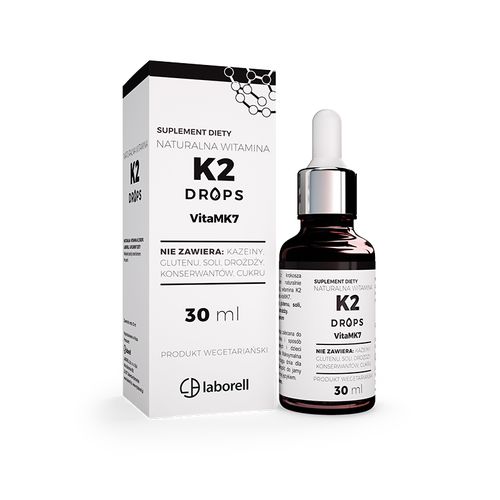 Suplement diety WITAMINA K2 DROPS LABORELL to bogate źródło witaminy K2. Witamina ta jest wytwarzana przez drobnoustroje jelita czczego i krętego, a w niewielkich ilościach występuje także w mięsie, jajach i produktach mlecznych. Witamina K2 przyczynia się do prawidłowej krzepliwości krwi oraz pomaga w utrzymaniu prawidłowego stanu kości.