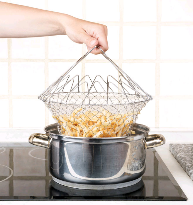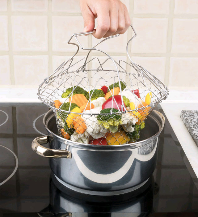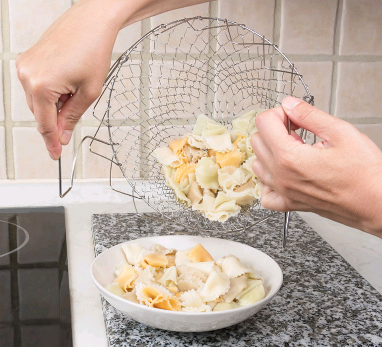 Innowacyjna konstrukcja wkładu czyni go niezwykle praktycznym, prostym w użyciu i łatwym do przechowywania. Jego wymiary sprawiają, że bez problemu zmieści się w większości garnków. Po zakończonym gotowaniu, koszyk można łatwo złożyć i schować do szuflady, dzięki czemu zaoszczędzisz miejsce w swojej kuchni. Dodatkowo, można go bezpiecznie myć w zmywarce do naczyń, co znacznie ułatwia utrzymanie czystości.