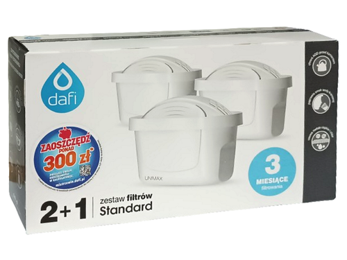 Zestaw filtrów Dafi UNIMAX składający się z 3 filtrów, przeznaczonych do oczyszczania wody kranowej. Jeden filtr jest w stanie oczyścić do 200 litrów wody z kamienia, chloru, niektórych metali ciężkich oraz związków organicznych, poprawiając przy tym smak wody. Filtry wyprodukowane w Polsce, posiadają certyfikat BPA free.