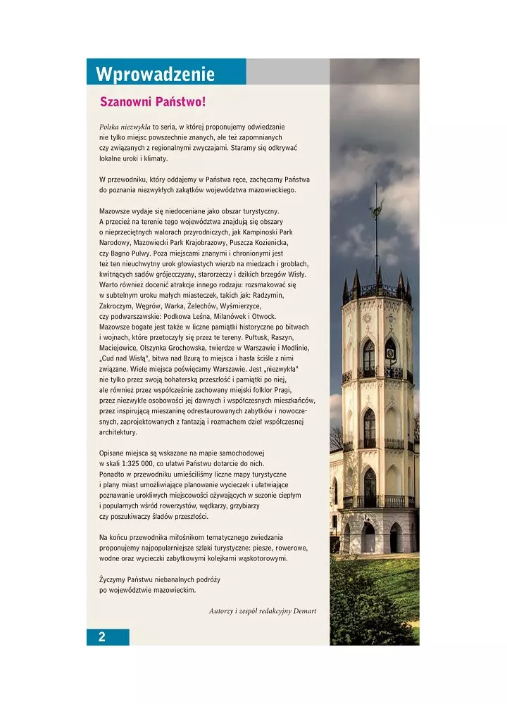 Mazowsze to nie tylko atrakcje Warszawy, choć są one niezaprzeczalne. Oprócz starszych i nowszych symboli stolicy, takich jak: Zamek Królewski, kolumna Zygmunta, wpisana na listę UNESCO Starówka, Pałac Kultury, metro oraz Centrum Nauki Kopernik. Warszawa to miasto bardzo zielone, z licznymi rezydencjami pałacowymi, ze specyficznym folklorem Pragi, z obiektami muzealnymi, które zostały zauważone poza granicami kraju. Chodzi chociażby o Muzeum Powstania Warszawskiego oraz Muzeum Historii Żydów polskich Polin. Podwarszawskie miasta-ogrody takie jak Milanówek czy Podkowa Leśna przyciągały świat artystyczny i przedwojennej finansjery. A zielony charakter stolicy przeciętej Wisłą z brzegami o naturalnym charakterze, podkreśla sąsiedztwo Kampinoskiego Parku Narodowego, co jest ewenementem na skalę światową. Takim sąsiedztwem może się poszczycić tylko jeszcze jedna stolica – Nairobi – w afrykańskiej Kenii. Na Mazowszu znajdują się także inne duże kompleksy przyrodnicze: Puszcza Kozienicka na południu, Mazowiecki PK na wschód od Warszawy, Bagno Pulwy między Puszczą Białą, a Narwią, Puszcza Zielona na północy, a to tylko największe z nich. Dzięki niedostępnym niegdyś puszczom do dziś przetrwał kurpiowski folklor, a imprezy i potrawy kurpiowskie są obecnie prawdziwym magnesem na turystów spragnionych rozkoszowania się lokalnymi tradycjami. Na Mazowszu pozostały liczne pamiątki po bitwach i wojnach. Miejsca i hasła ściśle z nimi związane można by długo wymieniać: Pułtusk, Raszyn, Maciejowice, Olszynka Grochowska, twierdze w Warszawie i Modlinie, „Cud nad Wisłą”, bitwa nad Bzurą. Zapraszamy!