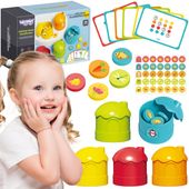 Wprowadź swoje dziecko w świat nauki i rozpoznawania kolorów z zestawem WOOPIE Gra Logiczna Sorter Nakarm Zwierzątka! Ta edukacyjna gra typu matching game (gra w dopasowywanie) jest idealna dla dzieci od 3 roku życia. Zestaw zawiera pięć kolorowych pojemników - domków uroczych zwierzątek i żetony z naklejkami pokarmów, a także aż 20 kart z zadaniami logicznymi. Głównym celem jest dopasowanie żetonów do odpowiednich domków, co rozwija rozpoznawanie barw, logiczne myślenie i koordynację ręka-oko. Domki należą do sympatycznych postaci, takich jak pingwin, pszczoła czy małpka, co dodatkowo zachęca do zabawy. To doskonały sposób na łączenie przyjemnego z pożytecznym, przygotowując malucha do nauki matematyki i rozwijając jego zdolności koncentracji.