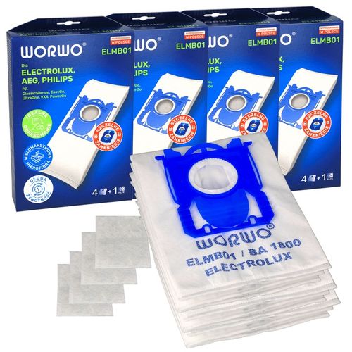 ✔️ Komplet 16 worków plus 4 filtry wlotowe, kompatybilny z seriami odkurzaczy Electrolux, Philips i AEG z logiem S-BAG.