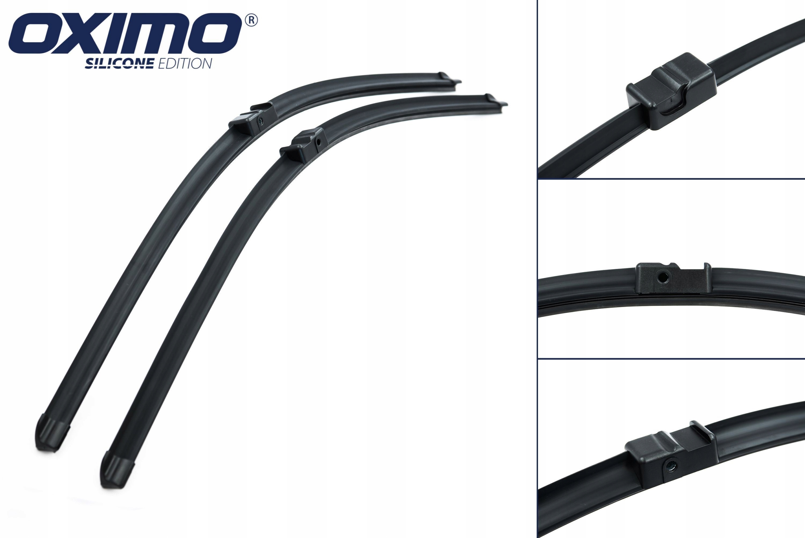 Dedykowane wycieraczki firmy Oximo posiadają mocowanie pasujące do konkretnego modelu i rocznika samochodu, a także odpowiednie długości. Wycieraczki o konstrukcji bezszkieletowej ze zintegrowanym spojlerem. Pióra stworzone z mieszanki gumy z dodatkiem silikonu oraz warstwy PTFE (teflon) zapewniają skuteczne zbieranie wody z szyby oraz cichą i długą pracę w każdych warunkach pogodowych. Części metalowe wykonane z wytrzymałej stali typu High-Carbon w całości ocynkowanej, aby długo i skutecznie chronić przed korozją