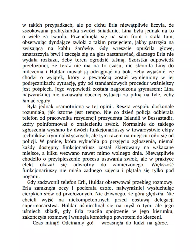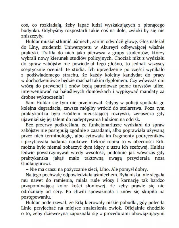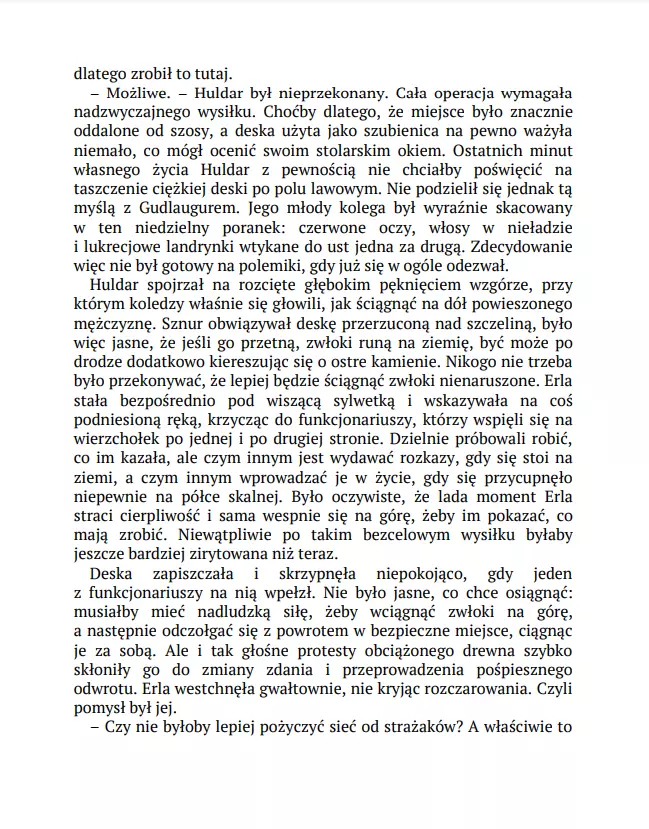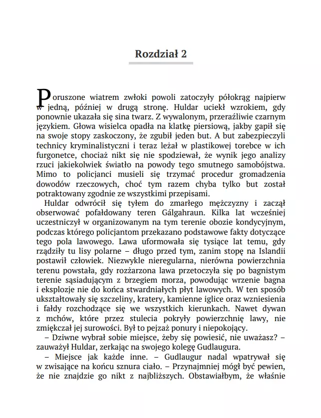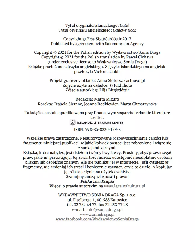 Gálgahraun, ponure lawowisko na obrzeżach Rejkiawiku. Niegdyś miejsce egzekucji, dziś – atrakcja turystyczna. Aż do tego poranka, kiedy znaleziono tam wiszącego mężczyznę. Gwóźdź wbity w jego klatkę piersiową dowodzi, że to nie było samobójstwo, choć z przyczepionej nim wiadomości został tylko skrawek papieru. Gdy policja udaje się do mieszkania mężczyzny, okazuje się, że sprawa zamordowanego to nie jedyna zagadka, jaką mają do rozwiązania: w środku został czteroletni chłopiec. Wygląda na to, że nie ma żadnego związku z ofiarą, ale jego rysunki wskazują na to, że był świadkiem czegoś strasznego. Detektyw Huldar rozpoczyna polowanie na zabójcę, a psycholog dziecięca Freya szuka rodziców chłopca. Kolejne elementy powoli tworzą mroczną układankę: historię przemocy, przywilejów i zemsty. „Czuły portret codziennych ludzkich problemów i frapująca tajemnica czynią tę powieść szczególnie udanym thrillerem. Ekscytujący, zręcznie skonstruowany i napisany kryminał, który porusza najbardziej palące współczesne problemy.” „Frettabladid” „Makabrycznością często przypomina Stephena Kinga. Islandzkie długie ciemne noce są najbardziej przerażające w klimatycznych thrillerach Sigurðardóttir.” „Financial Times”