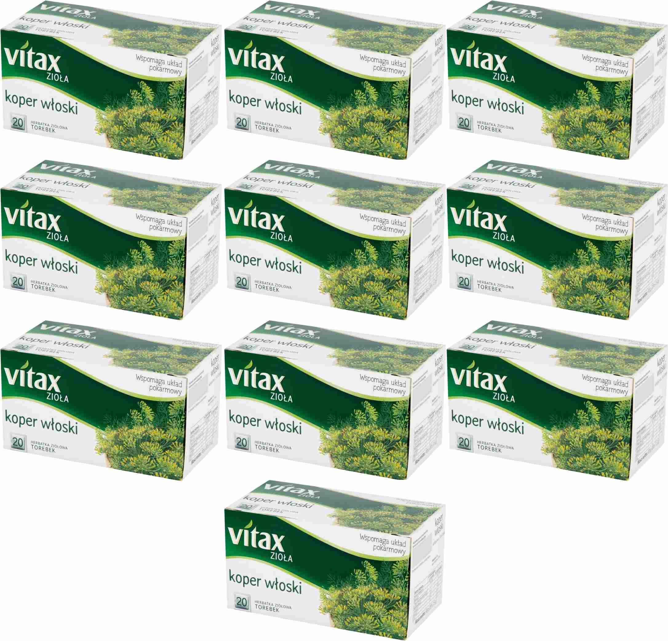 Koper włoski Vitax 20 torebek przyczynia się do prawidłowego funkcjonowania układu pokarmowego. Wspomaga trawienie, apetyt oraz pomaga usunąć uczucie pełności i wzdęcia. Korzystny efekt wynikający z deklarowanego działania występuje w przypadku spożycia naparu z 2 torebek dziennie. Pić 2 razy dziennie po 1 filiżance naparu, przygotowanego z 1 torebki (1,5g kopru włoskiego) na 200 ml wody. Nie stosować w przypadku nadwrażliwości bądź uczulenia na koper włoski. Zrównoważony sposób żywienia i zdrowy tryb życia to ważne elementy dla utrzymania prawidłowego stanu zdrowia.