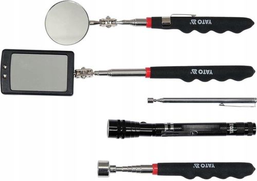 Zestaw zawiera wszystko, co niezbędne do przeprowadzenia dokładnej inspekcji: dwa lusterka, dwa chwtytaki magnetyczne oraz latarkę z elastycznym przegubem. Narzędzia te umożliwiają swobodny dostęp do trudno dostępnych miejsc i skuteczne rozwiązywanie problemów.