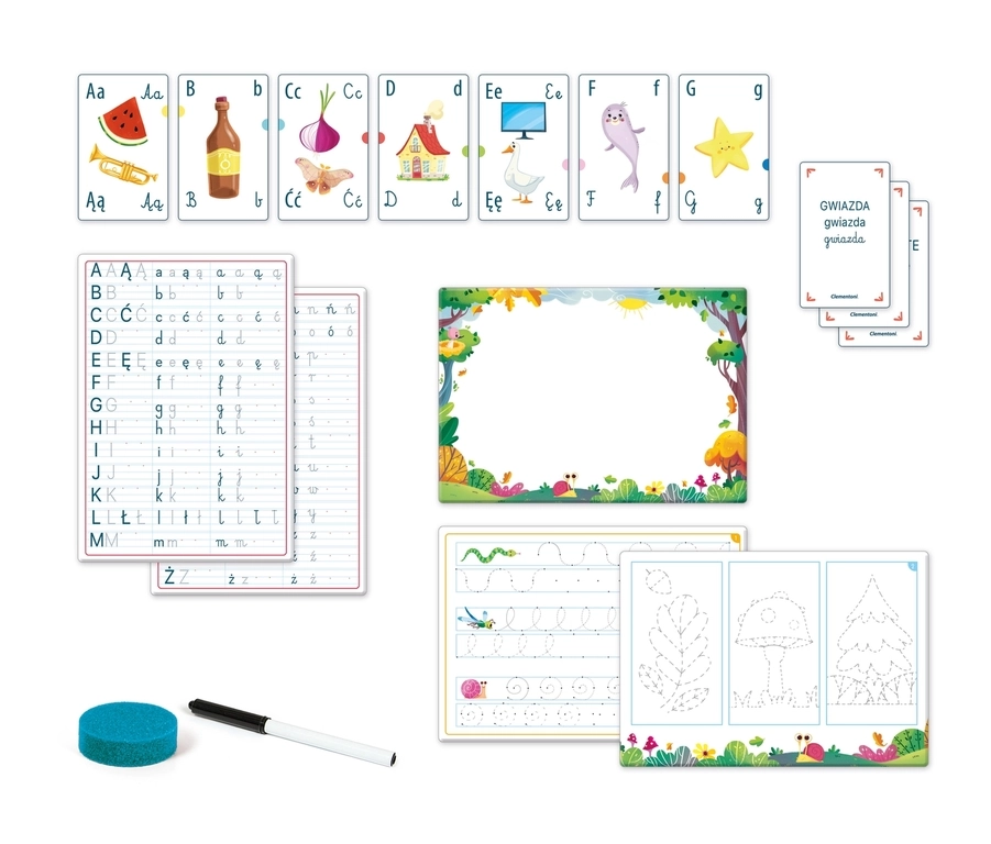 Zestaw do nauki pisania od Clementoni, to zabawka edukacyjna dla dzieci, która zachęci do ćwiczeń. W zestawie znajdziemy kilka kolorowych kart z zadaniami o różnym stopniu trudności – znajdziemy w nim, miedzy innymi: zadania z rysowaniem szlaczków, pisaniem liter. Na kartach, oprócz zadań, znajdują się atrakcyjne obrazki, które są doskonałym urozmaiceniem zabawy. Dzieci z chęcią będą próbowały swoich możliwości, rozwiną zdolności manualne i logiczne myślenie. Wymiary: 5.0 x 37.0 x 28.1 cm