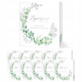 Charakterystycznym elementem tych zaproszeń są piękne, naturalne wieńce z zielonych liści eukaliptusa, które w harmonijny sposób komponują się z białym tłem, dodając świeżości i niepowtarzalnego uroku. Elegancki, srebrny napis "Zaproszenie" oraz "Pierwsza Komunia Święta" wprowadza nutkę blasku i wyrafinowania.