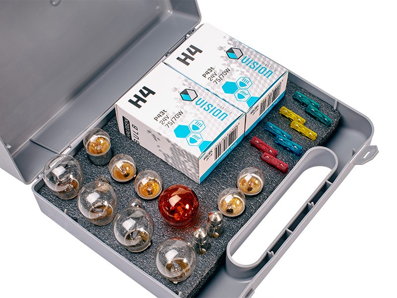 Zasobnik VISION 2x H4 24V 75/70W + 22 elementy to niezwykle przydatny zestaw, który każdy kierowca ciężarówki powinien mieć w swoim pojeździe. Oferując 24 wysokiej jakości elementy, ten zestaw to gwarancja bezpieczeństwa i gotowości na nieprzewidziane sytuacje na drodze. Wyposażenie to daje ci wszystkie niezbędne żarówki oraz bezpieczniki, które mogą okazać się nieocenione w sytuacjach awaryjnych.