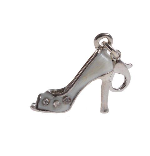 Metalowa zawieszka - biały bucik na obcasie, z kryształkami.