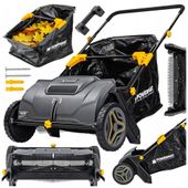 Obrotowe szczotki uruchamiane ruchem kół wciągają liście, trawę i drobne gałązki do kosza, zapewniając równomierną pracę bez silnika.
