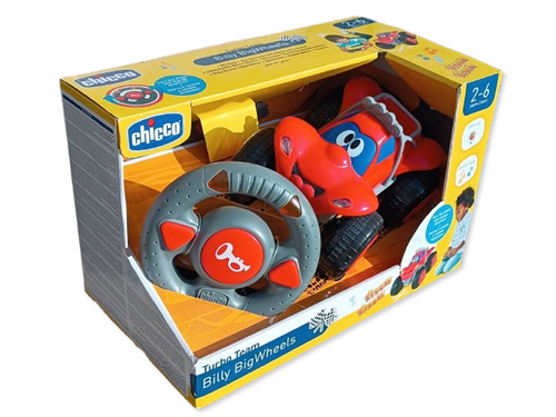 Zdalnie sterowane, wesołe, czerwone autko Billy marki Chicco, wykonane z bardzo dobrych jakościowo materiałów. Autko posiada duże gumowane koła zapewniające dobrą przyczepność, mechanizm regulujący kąt skrętu, włącznik na spodzie oraz pilot w kształcie kierownicy. Sterowanie autem jest bardzo wygodne, umożliwia sterowanie do przodu, tyłu, w lewo i w prawo. Skręty w lewo i prawo wykonuje się poprzez skręt kierownicy w odpowiednią stronę, tak jak w prawdziwym aucie. W trakcie skręcania na pilocie zapalają się światełka sygnalizujące w którą stronę autko skręca. Wciśnięcie na pilocie środkowego przycisku powoduje, że autko zaczyna trąbić i mrugać wszystkimi światłami. Gdy auto porusza się do przodu słychać odgłos pracującego silnika i świecą mu się przednie światła. Gdy zaś auto porusza się do tyłu świecą mu się tylne światła a auto wydaje sygnał ostrzegawczy. Zabawka zasilana jest 4 bateriami AA 1,5V, pilot 3 bateriami AAA 1,5V (baterie nie są dołączone do zestawu). Zabawka pracuje na częstotliwości 2,4GHz (zakres częstotliwości 24410-2460Mhz). Produkt posiada certyfikat CE i przeznaczony jest dla dzieci w wieku od 2 do 6 lat.
