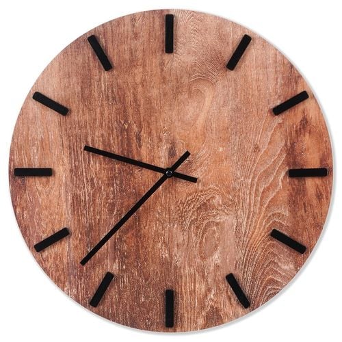 ✅ SOLIDNY - Zegar wykonany z wysokiej jakości płyty MDF, która swoim wyglądem przypomina drewno. Tarcza jest w brązowym kolorze, a wskazówki oraz kreski oznaczające godzinę są w czarnym kolorze.