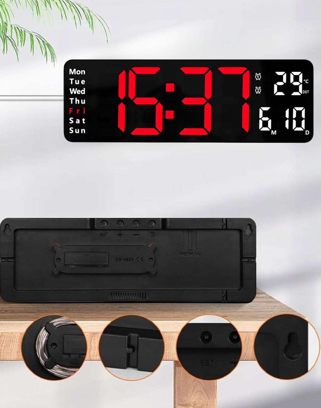 ⭐Port zasilania DC 5V/1A — podłącz zegar np. do ładowarki USB, powerbanku lub komputera